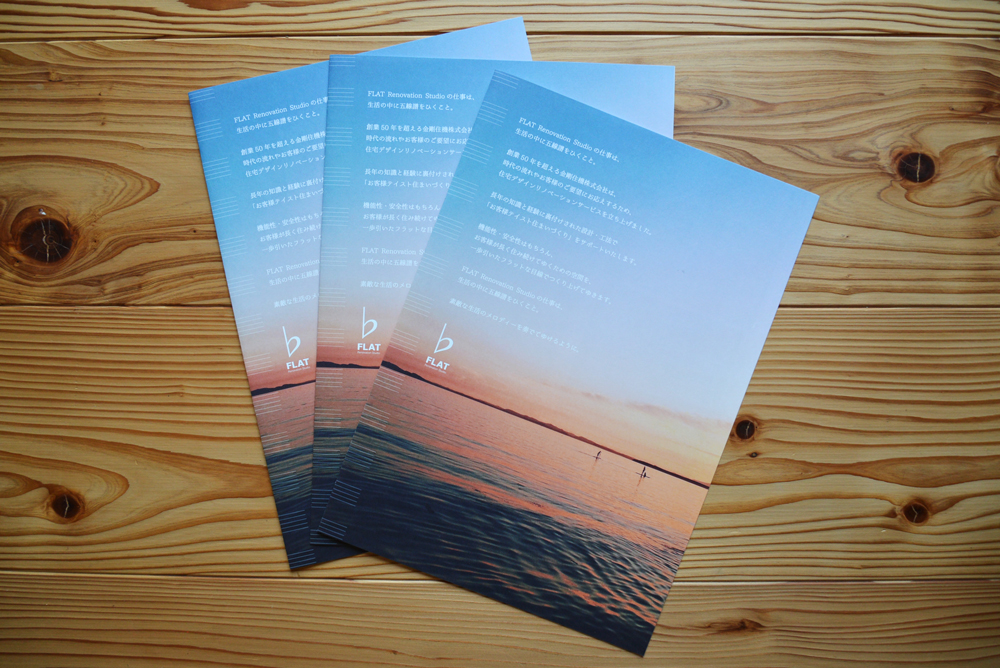 FLAT様はブランドの立ち上げからお手伝いさせて頂いており、いくつかのフライヤーは制作してきましたが、会社案内の制作は初となります。